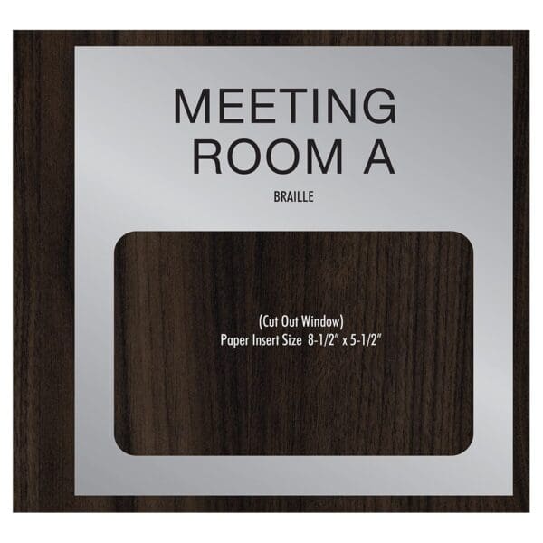 User-generated paper insert slides directly into brand-approved meeting room ID sign. Meeting Room sign is ADA compliant, featuring tactile copy and braille. Sign comes with foam tape for mounting and is for interior use only.