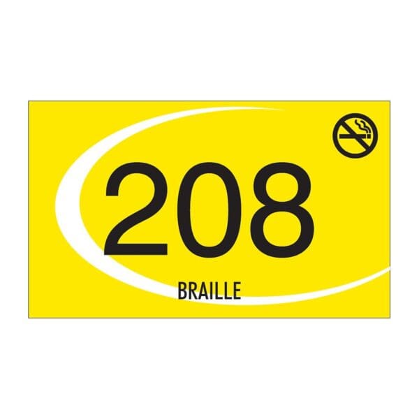Establish an easy-to-follow room numbering system in your hotel with brand-approved room number signs. Each sign features raised text, symbols and Grade 2 Braille for ADA-compliance. Non-Smoking Room Number Signs come with a No Smoking symbol on front and foam tape on back for easy mounting. For interior use only.