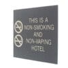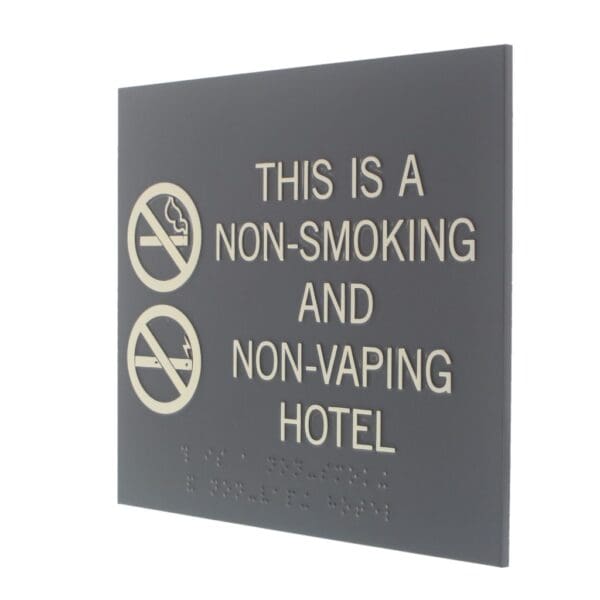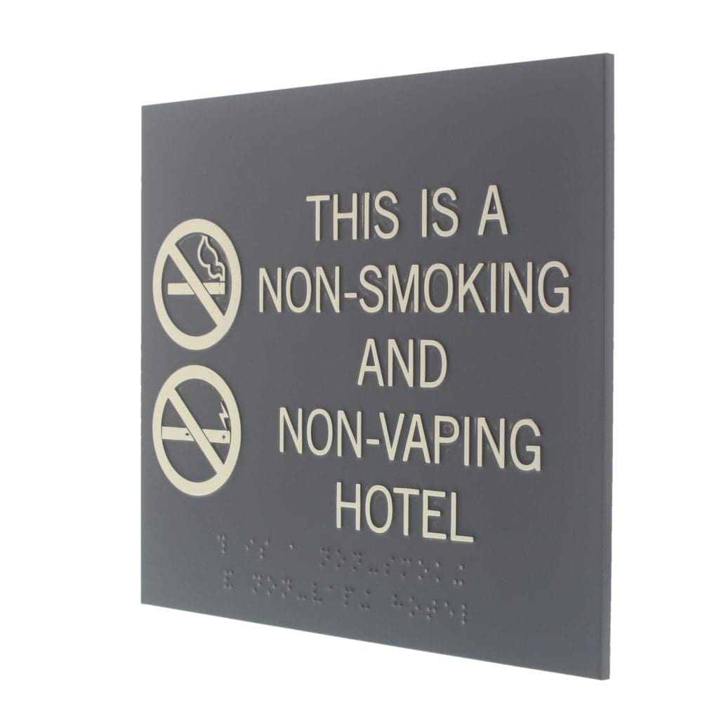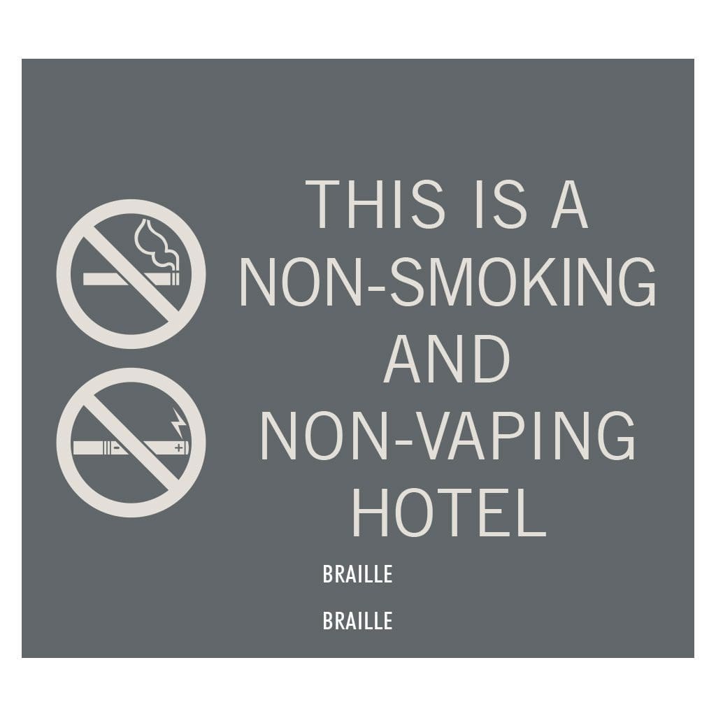 Mark areas of your hotel as smoke-free with no smoking signs. Text and symbols are flat and sign mounts easily with foam tape.