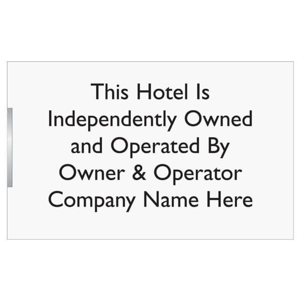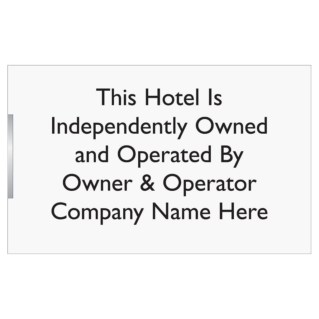 Specify the owner and operator of your hotel with brand-approved Owner and Operator signage. Sign features flat copy and comes with foam tape on the back for easy mounting. For interior use only.