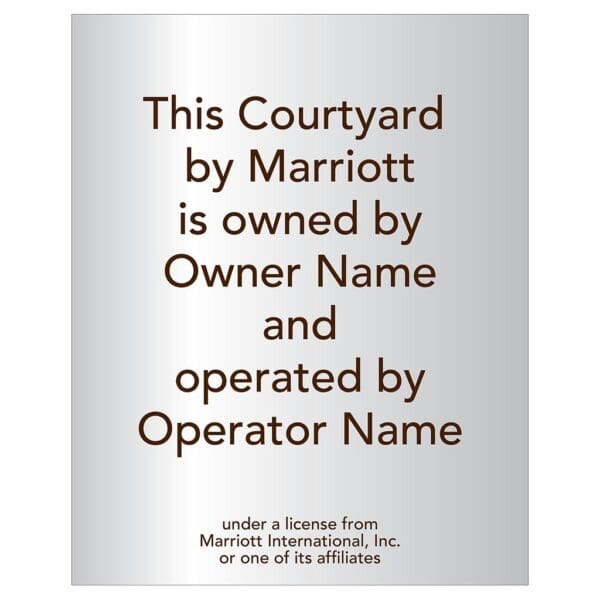 Specify the owner and operator of your hotel with brand-approved Owner and Operator signage. Sign features flat copy and comes with foam tape on the back for easy mounting.