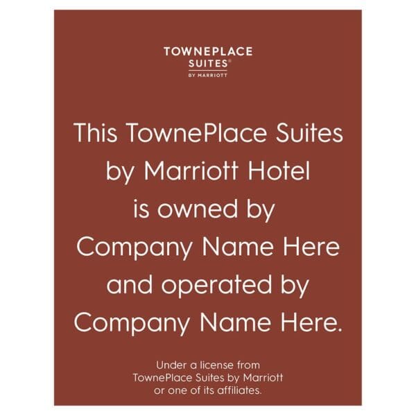 Specify the owner and operator of your hotel with brand-approved Owner and Operator signage. Sign features flat copy and comes with foam tape on the back for easy mounting. For interior use only.