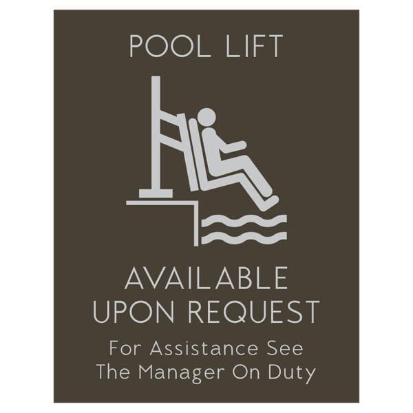 Brand-Approved Pool Lift informationals ensure that your guests remain safe and informed while using the hotel pool. Text on sign is printed flat for exterior use only. Use the selector below to choose foam tape or hardware for mounting.