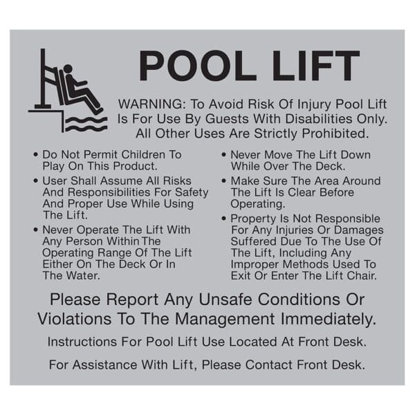 Brand-Approved Pool Lift signs ensure that your guests remain safe and informed while using the hotel pool. Text on the sign is printed flat and is used for exterior use only. Use the selection below to choose wall mount or post/fence mount (hardware provided).