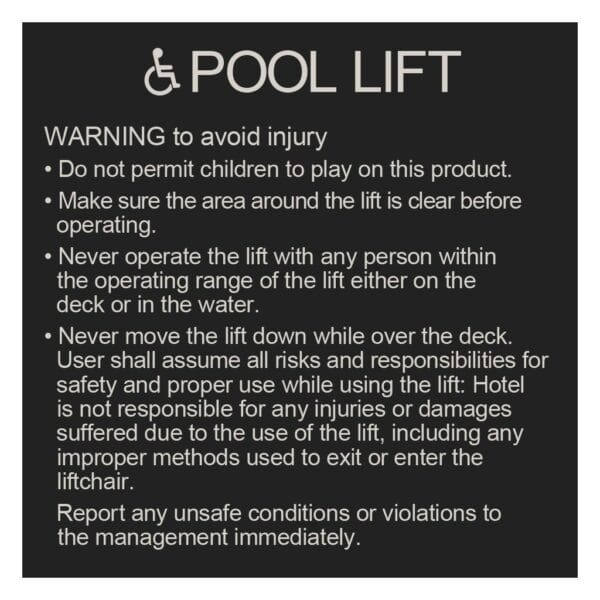Brand-Approved Pool Lift signs ensure that your guests remain safe and informed while using the hotel pool. Text on sign is flat. Use the selection below to choose wall mount or post/fence mount (hardware provided).
