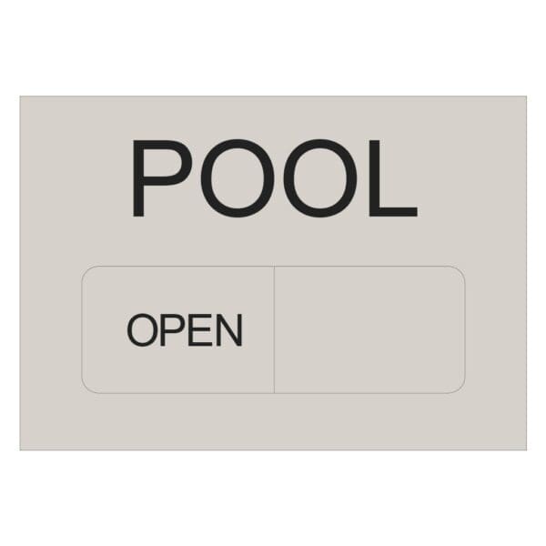 Text on pool sign in flat and has a sliding panel that reveals “Open/Closed” to let guests know when they can use the hotel pool