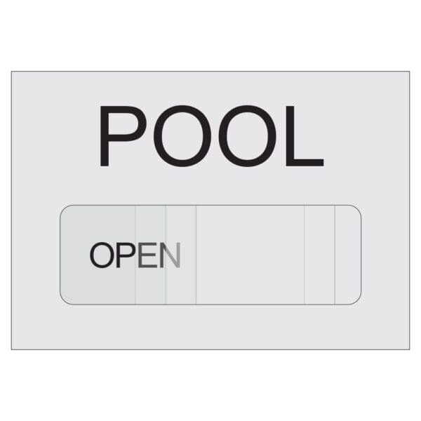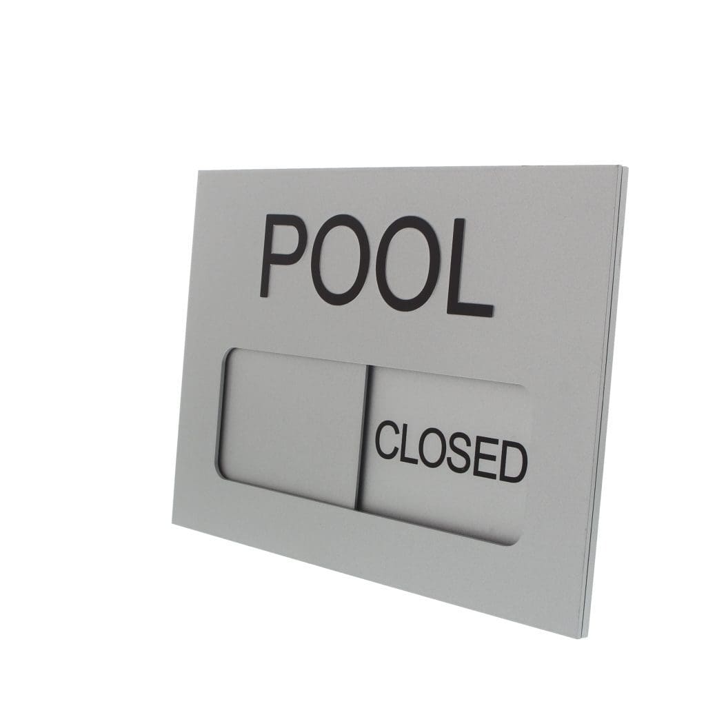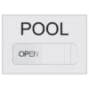 Text on pool sign in digitally printed and has a sliding panel that reveals “Open/Closed” to let guests know when they can use the hotel pool