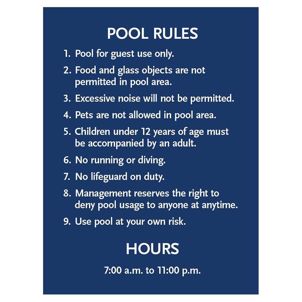 Brand-Approved Pool Rules signs ensure that your guests remain safe and informed while using the hotel pool. Text on sign is flat and is for exterior use only. See below to select between wall mount or a post/fence mount (hardware provided).