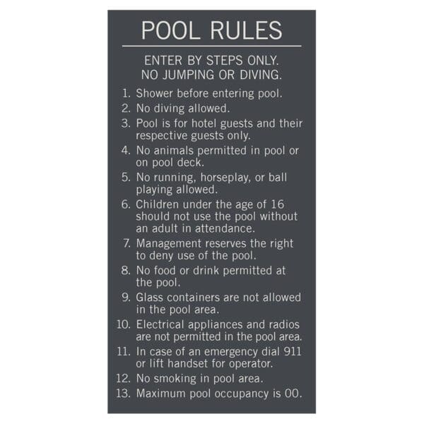Brand-Approved Pool Rules signs ensure that your guests remain safe and informed while using the hotel pool. Text on sign is flat and is for exterior use only. See below to select between wall mount or a post/fence mount (hardware provided).