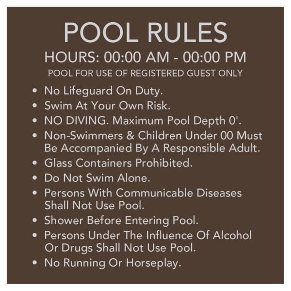 Brand-Approved Pool Rules signs ensure that your guests remain safe and informed while using the hotel pool. Text on sign is flat and is for exterior use only. See below to select between wall mount or a post/fence mount (hardware provided).