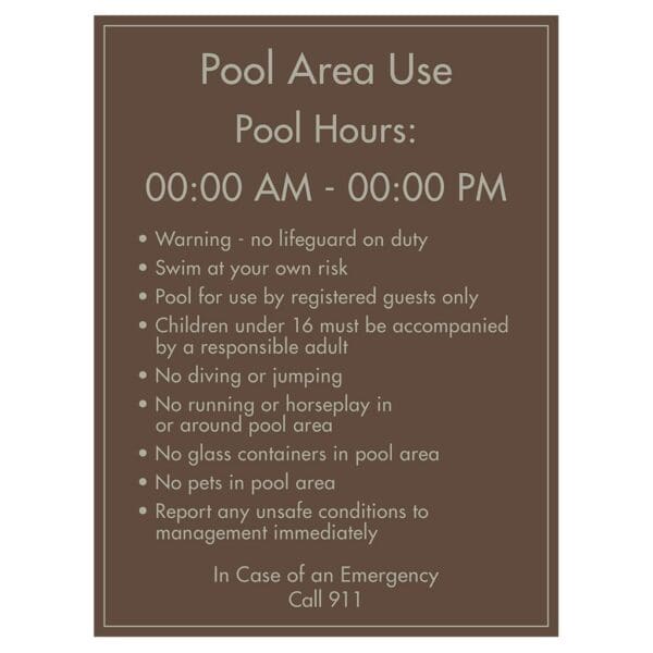 Hotel Brand Signs – Approved Pool Rules signs ensure that your guests remain safe and informed while using the hotel pool. Text on sign is printed flat for exterior use only. Use the selector below to choose foam tape or hardware for mounting.