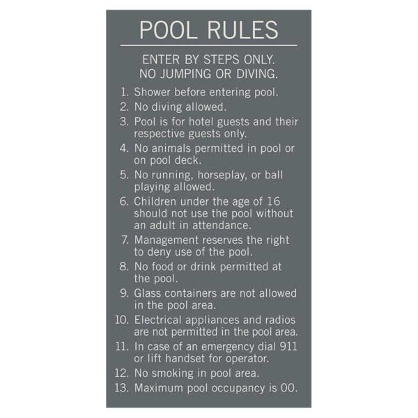 Brand-Approved Pool Rules signs ensure that your guests remain safe and informed while using the hotel pool. Text on sign is printed flat for exterior use only. Use the selector below to choose foam tape or hardware for mounting.