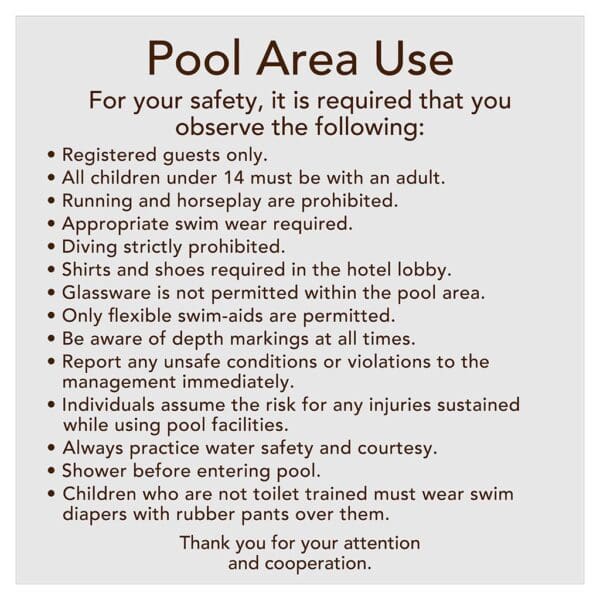 Brand-Approved Pool Rules signs ensure that your guests remain safe and informed while using the hotel pool. Text on sign is flat and is for exterior use only. See below to select between wall mount or a post/fence mount (hardware provided).