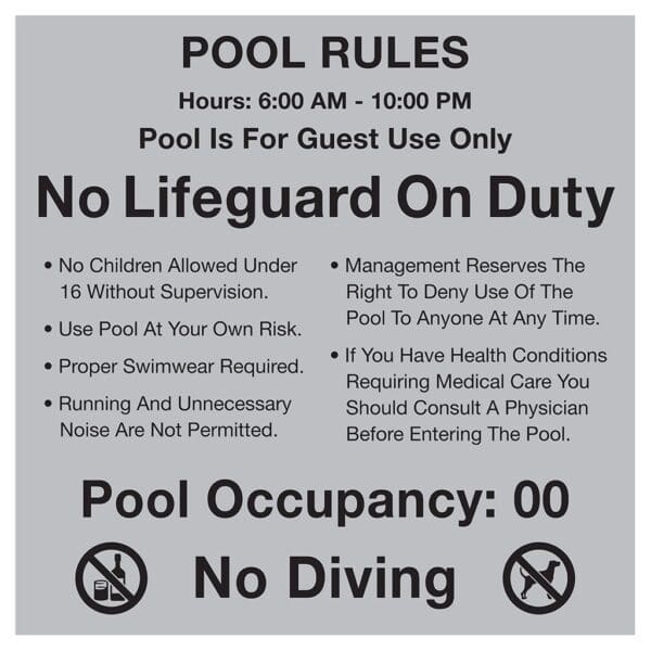 Brand-Approved Pool Rules signs ensure that your guests remain safe and informed while using the hotel pool. Text on sign is flat and is for exterior use only. See below to select between wall mount or a post/fence mount (hardware provided).