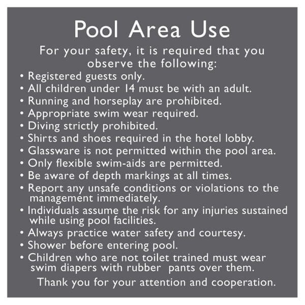 Brand-Approved Pool Rules signs ensure that your guests remain safe and informed while using the hotel pool. Text on sign is flat and is for exterior use only. See below to select between wall mount or a post/fence mount (hardware provided).