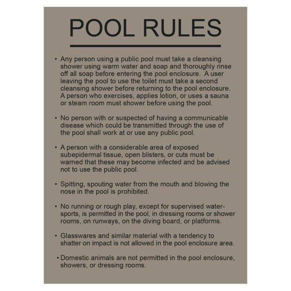 Brand-Approved Pool Rules signs ensure that your guests remain safe and informed while using the hotel pool. Text on sign is flat and is for interior and exterior use. Comes with foam tape for mounting.