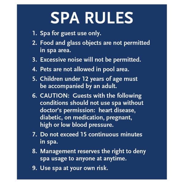 Brand-Approved Spa Rules signs ensure that your guests remain safe and informed while using the hotel pool. Text on sign is flat and is for exterior use only. See below to select between wall mount or a post/fence mount (hardware provided).