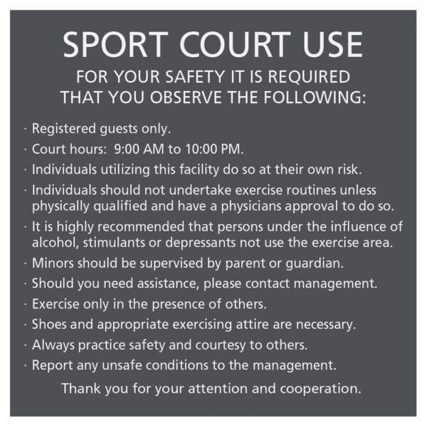 Keep guests safe while using the hotel sport court with signs that clearly state all ground rules for use. Signs feature flat text and come with foam tape on the back for mounting.