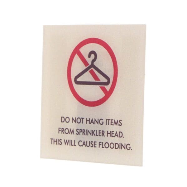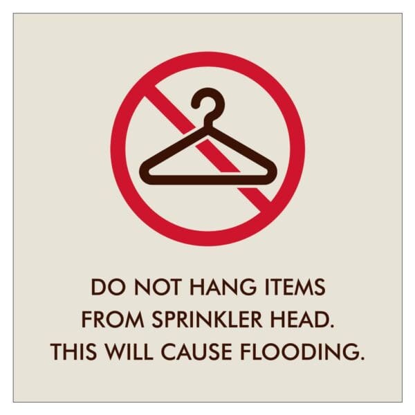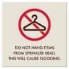 Sprinkler warning features text and red and black “no hanger” symbol. Signs come with foam tape on back for easy mounting.