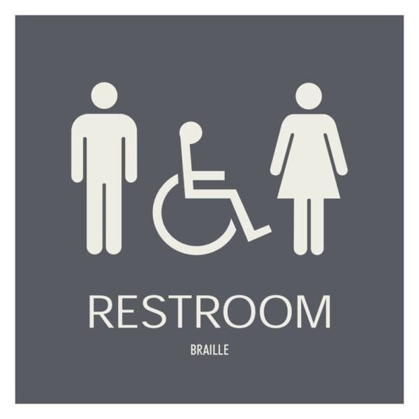 Mark each bathroom with a restroom identification sign. Restroom signs feature raised text, symbols and Grade 2 Braille. Signs come with foam tape on back for easy mounting. For interior and exterior use.
