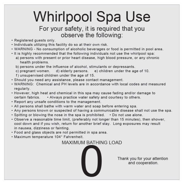 Brand-Approved Whirlpool Rules signs ensure that your guests remain safe and informed while using the hotel whirlpool. Text on sign is flat and is for interior and exterior use. See below to select between wall mount or a post/fence mount (hardware provided).